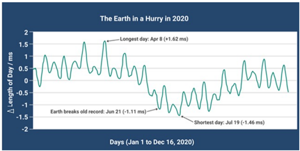 自有記錄以來,地球平均每天有個1~2毫秒的減慢,通常2-3年就會有一次閏秒。自1958年至今,已累計進行了37次閏秒(當前UTC協(xié)調(diào)世界時UTC比TAI國際原子時慢37秒,圖1)。而距離最近一次的閏秒還是5年多以前的2017年1月1日。也就是說,近5年來地球自轉(zhuǎn)的速度一直在加快,2020年的6月19日,更是被記錄下50年來日長最短的一天(圖2)。這樣的趨勢至今并未減緩,而是有進一步變快的跡象(圖3)。