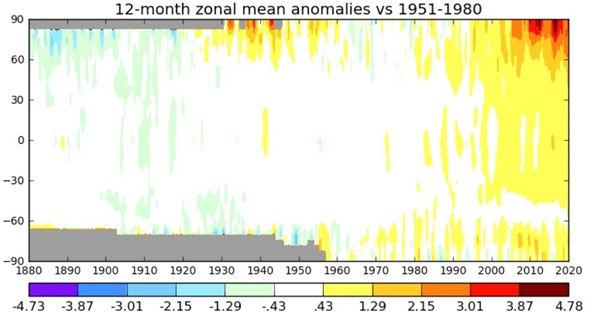 地球自轉(zhuǎn)存在不均勻性,除長期減慢是個確定性的變化外,還存在一些不規(guī)則變化。比如前面提到的全球氣候變暖,南北極冰川加劇融化。如果未來反常的氣溫升高若持續(xù)下去,則地球自轉(zhuǎn)還將繼續(xù)加快。所以不排除有第一次負閏秒的出現(xiàn),也就是采用對協(xié)調(diào)世界時減少一秒的方式使UTC和UT1的時刻差保持在一個恒定的范圍內(nèi)。因為地球自轉(zhuǎn)除了受固體成分影響外,還有地表的流體成分,如:地表水、地下水、海洋和地球大氣。角動量守恒定律和地球科學的觀測數(shù)據(jù)均表明,地球的總角動量在一定時期內(nèi)是守恒的。因此固體地球自轉(zhuǎn)的加快,則表示地球流體成分,如海洋、大氣的環(huán)流的總角動量在減小。就好比冬奧會上花樣滑冰運動員隨著音樂翩翩起舞,他們時而兩手打開伸展身姿,時而收攏身體旋轉(zhuǎn)跳躍。其實,隨著運動員身體打開,他們的轉(zhuǎn)動速度就會變慢。同樣道理,地球的自轉(zhuǎn)的速度也隨地表質(zhì)量分布的變化而變化。圖4為氣象站記錄的地表溫度100年來的歷史演化,縱軸為地理緯度,橫軸為時間,顏色代表地表溫度的變化,可以看到2000年之后,地表溫度比1910-2000年間的溫度明顯增大了。對比圖5的紅線梯度,2000年之后則出現(xiàn)了明顯的變緩趨勢。因此我們大膽和合理的猜測,地球自轉(zhuǎn)加快的現(xiàn)象和近期的地球氣候變化,極端天氣增多間存在著強關(guān)聯(lián)性。