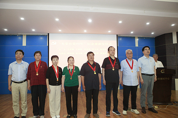 ????會議在莊嚴的國歌聲中拉開帷幕。陳改學宣讀王文、王喜霞、方福勝、劉春萍、李文成、楊菊梅、吳貴臣、紙明慧、趙云英、徐庚華、郭詠琴、慕菊娥12位老黨員獲得“光榮在黨50年”紀念章。國家授時中心主任張首剛、黨委書記竇忠為到場的6位老黨員頒發(fā)紀念章。